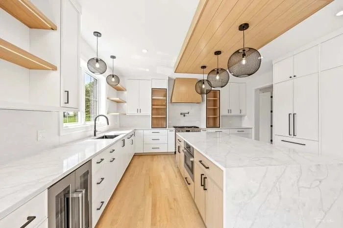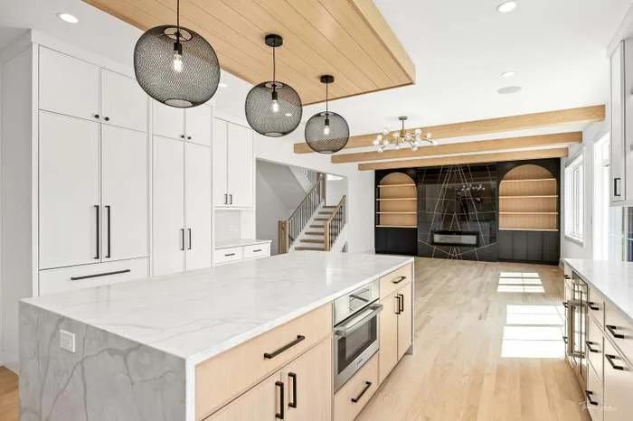 At the center of the home is a striking kitchen with sleek white finishes, built-in appliances, integrated lighting, and a large statement island crafted with rift-cut white oak cabinetry. The material palette feels both warm and architectural modern without feeling cold.